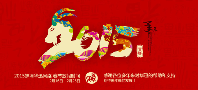 蚌埠華迅網(wǎng)絡(luò)科技有限公司2015新年放假時(shí)間為2015年2月16日至2月25日,假日期間如有需求請(qǐng)聯(lián)系:0552-3711772  15255232273